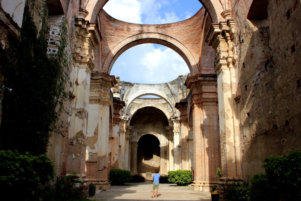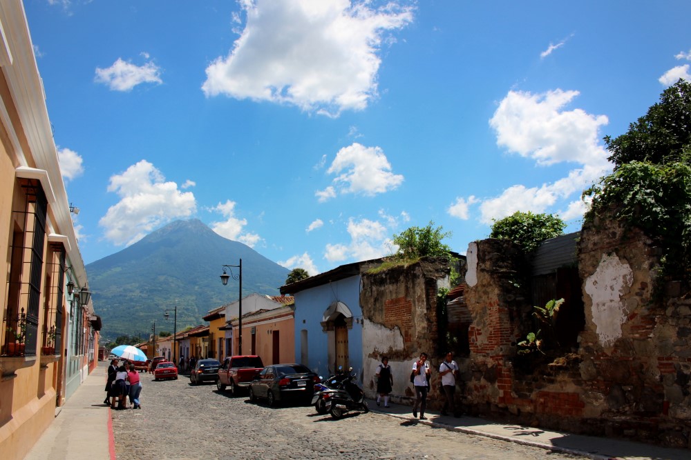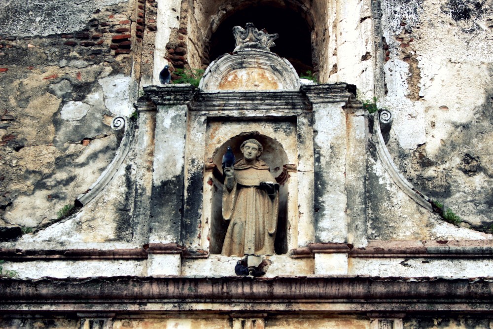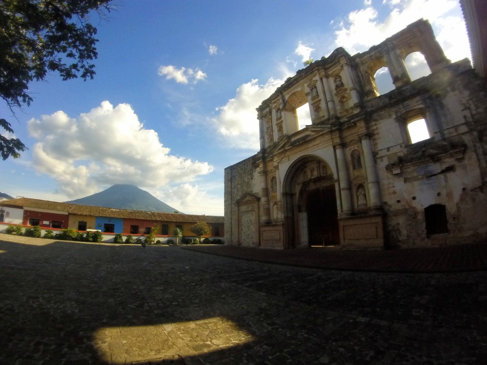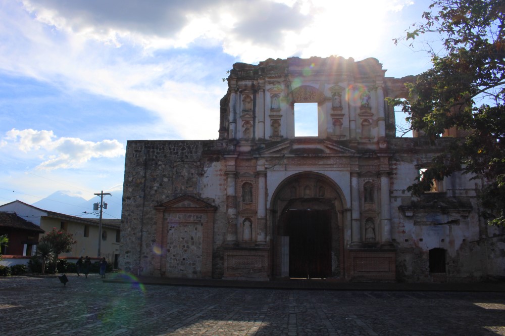 Nous sommes partis en direction d’Antigua au Guatemala, une cité coloniale que l’on croirait directement tirée d’une carte postale avec ses rues pavées, ses façades colorées, ses églises en ruines (ainsi que plein d’autres toujours sur pied), ses agences de tourisme à chaque coin de rue et son constant flot de gringos. A l’instar de Santa María qui domine la ville de Xela, Volcán de Agua surplombe Antigua de ses 3760 mètres, apparaissant ainsi en arrière-plan de toutes les photos et peintures de la ville. L’Antigua d’aujourd’hui a été fondée en 1541 mais a été en grande partie détruite par un tremblement de terre en 1773 qui a transformé la ville en musée architectural à ciel ouvert. De nombreux édifices ont été préservés à l’état de ruine, les impressionantes églises et autres magnifiques bâtiments datant de l’Empire Espagnol.