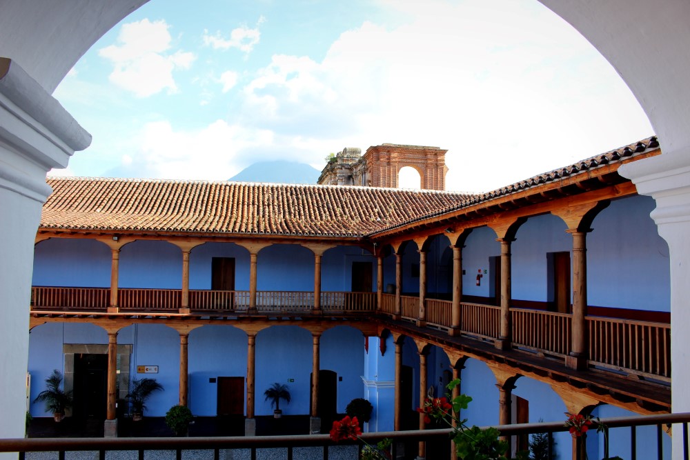 Iglesia y Convento de la Compañía de Jesús dépassant au dessus du Centro de Formación de la Cooperación Española, Volcán de Agua en arrière-plan.