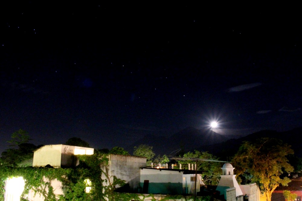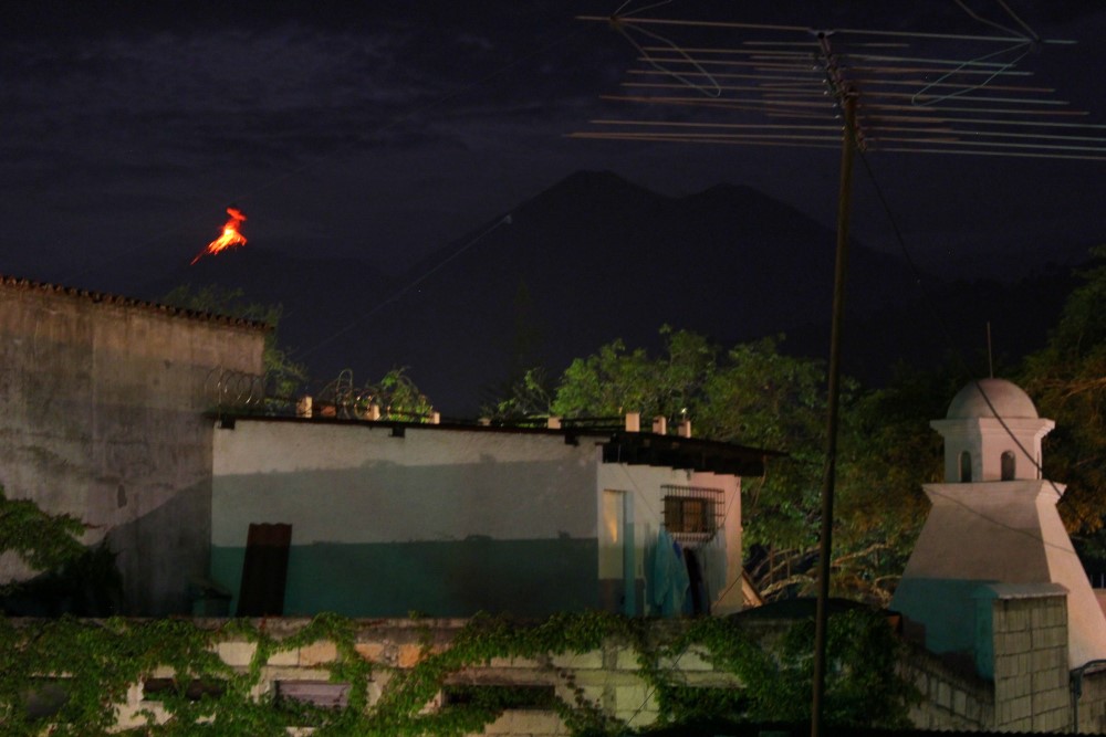 Nous pouvions voir le très actif Volcán de Fuego depuis la terrace de notre auberge. Durant le jour nous observions des panaches de cendre s’élevant dans le ciel toutes les 20 minutes, et à la nuit tombée nous pouvions voir la lave expulsée à la verticale avant de dévaler les pentes du volcan.