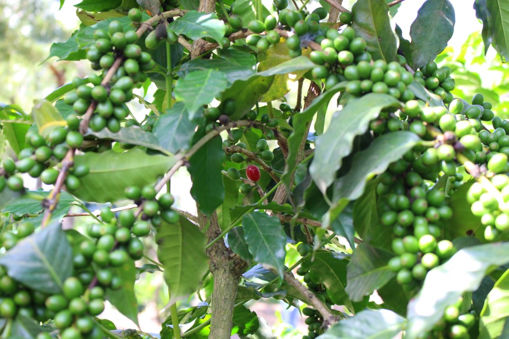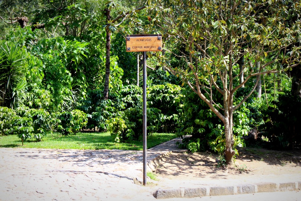 Ils nous ont expliqué leur technique particulière qui consiste à croiser les plants de café Arabica et Robusta. L’idée est de combiner la ténacité et la profondeur des racines Robusta avec la finesse et la qualité gustative de l’Arabica. Vous pouvez voir au milieu de la tige ce qui s’apparente à un bandage blanchâtre ; c’est l’endroit où se trouve la jonction entre la racine Robusta et le greffon Arabica.