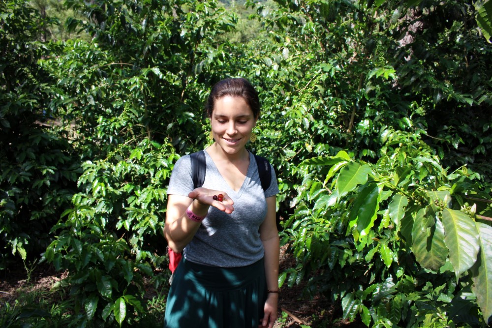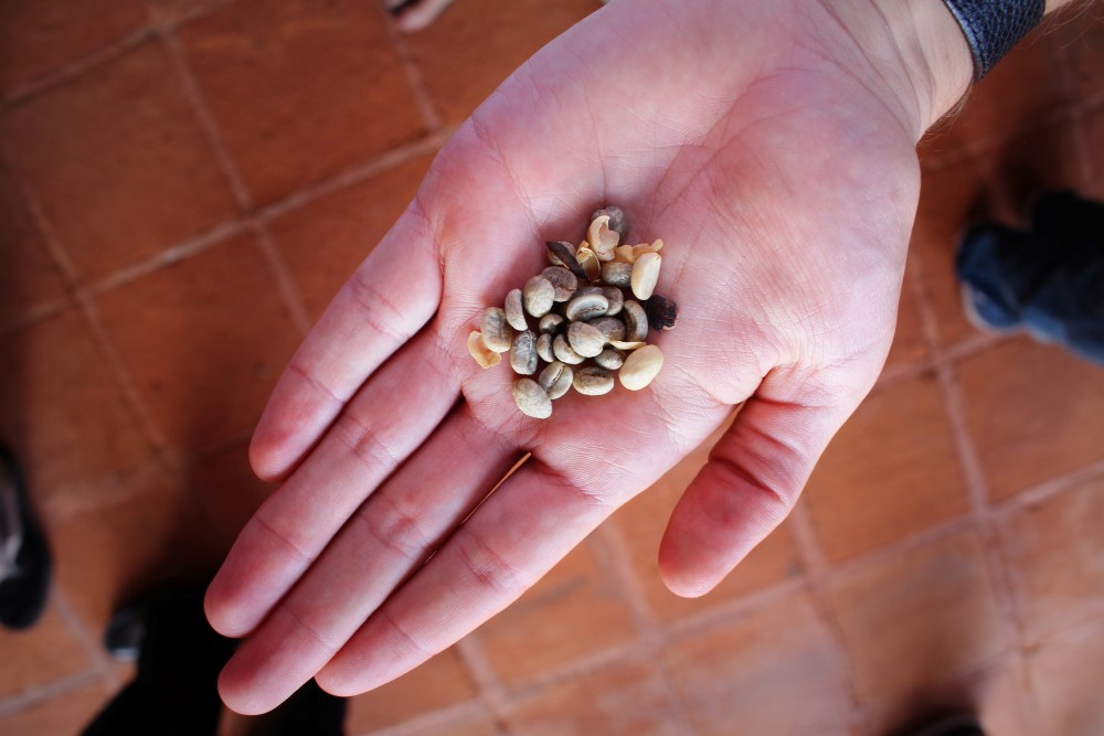 En écrasant légèrement le grain rouge en sortent deux graines pleines de glucose qui vont ensuite être fermentées, lavées, séchées puis torréfiées.