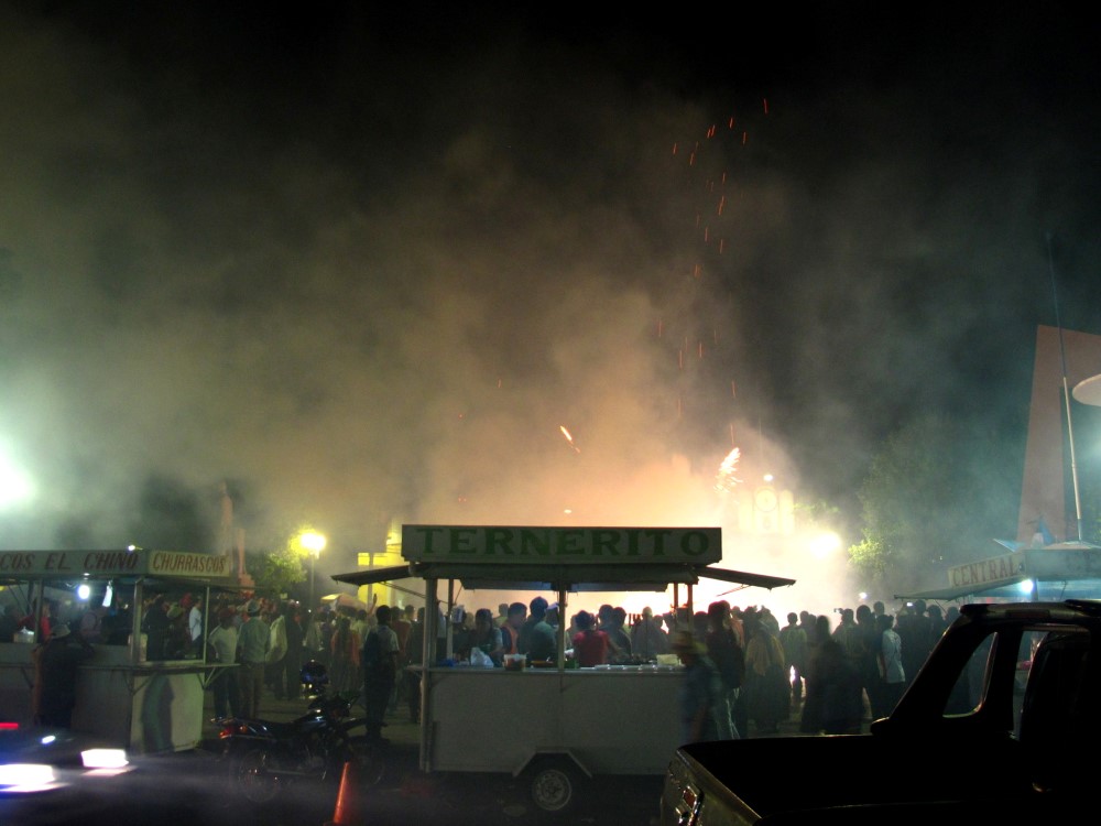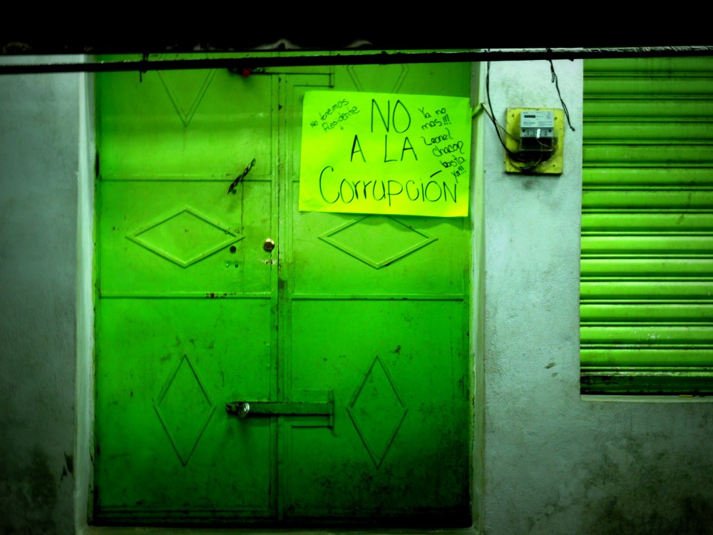 Premier arrêt, déjeuner, où tous les employés étaient occupés à fabriquer des pancartes et banderoles de protestation. Son t-shirt dit “Rompe la cadena de la corrupción” (Brise la chaine de la corruption).