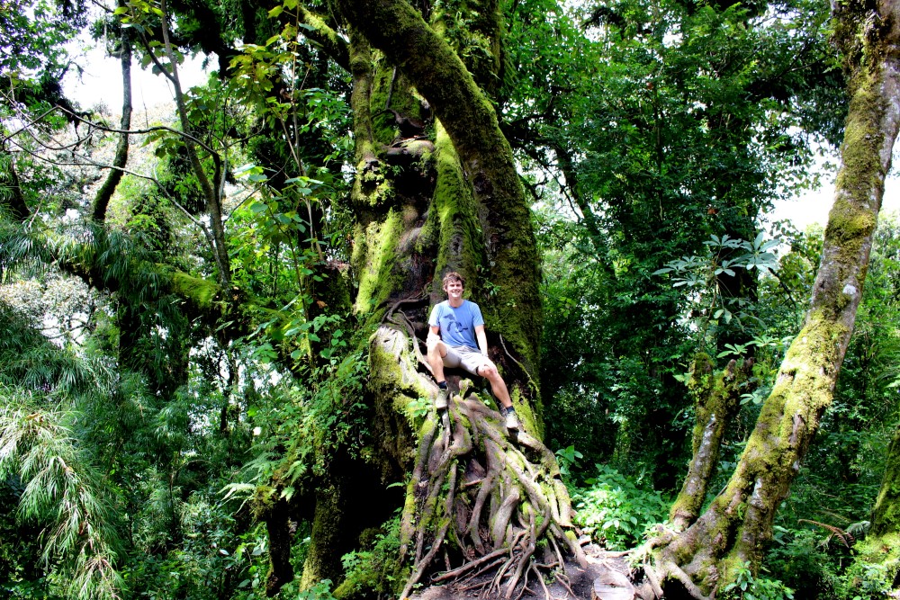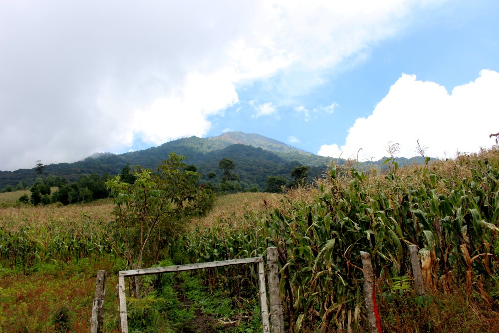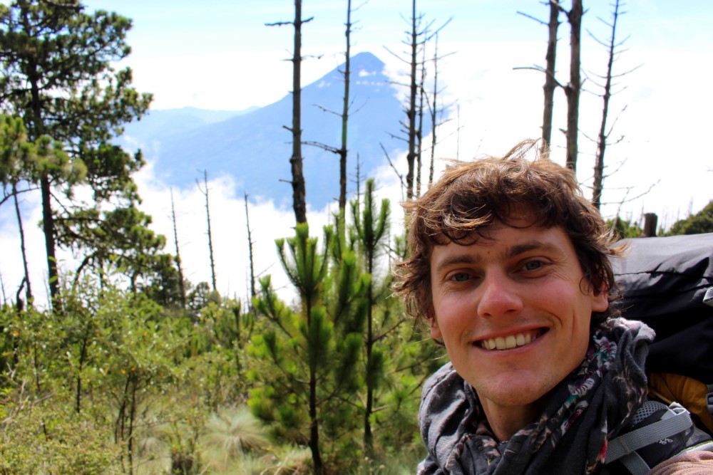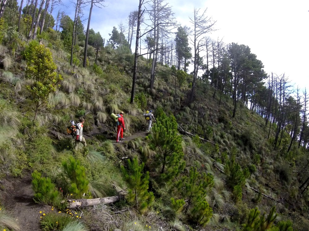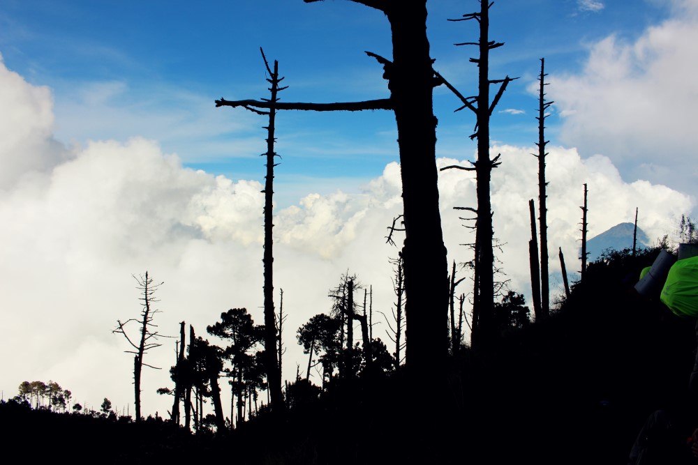 Randonneur joyeux dans un paysage funèbre. En 2006 un incendie a ravagé la forêt d’Acatenango. Les arbres qui ont survécu ont été affaiblis et sont depuis attaqués par un insecte (dendroctone du pin) qui perfore l’arbre pour se nourrir de l’écorce. L’insecte apporte avec lui un champignon qui se développe dans le tronc et tue l’arbre en 90 jours. L’unique remède aujourd’hui est la coupe des arbres contaminés pour éviter la propagation de ce fléau.