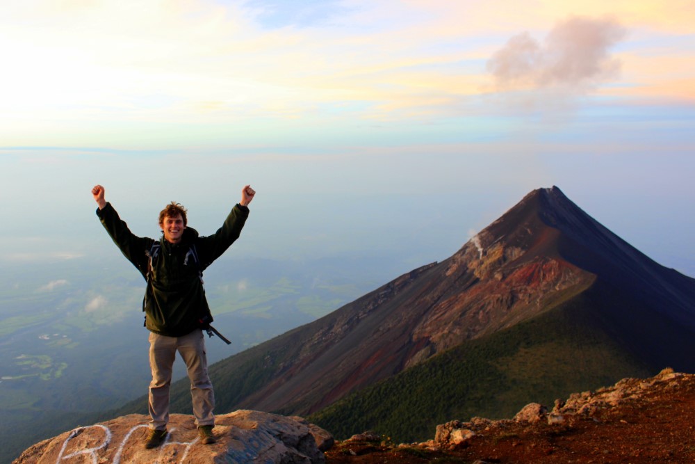Arrivée au sommet d’Acatenango. Séance selfie sur le bord du cratère avec Volcán de Agua en arrière-plan