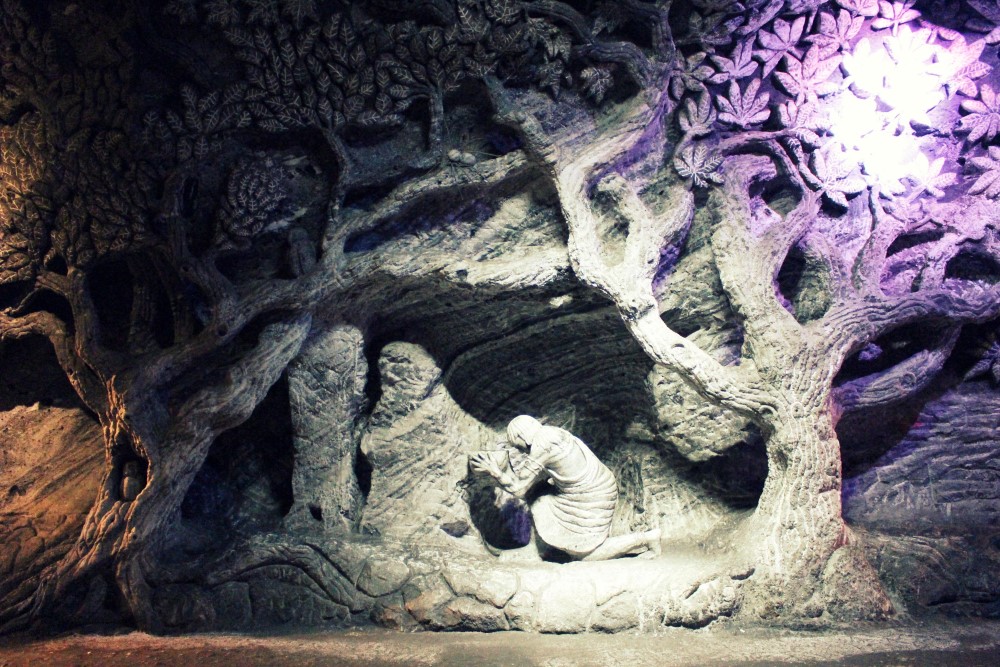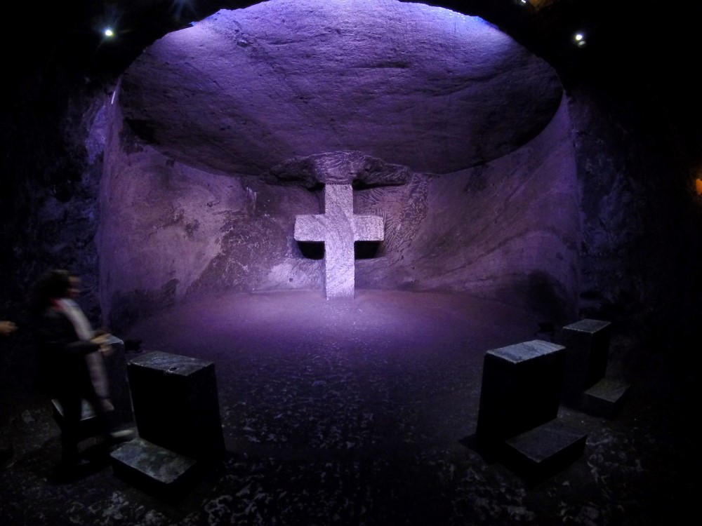 Nous nous sommes rendus à Zipaquirá pour visiter la Catedral de Sal, la Cathédrale de Sel. Comme son nom l’indique c’est une cathédrale construite à l’intérieur d’une mine de sel. Cathédrale qui, cependant, porte mal son nom puisqu’elle n’en est pas officiellement une, et toute cérémonie (mariage, baptème) qui y est célébrée est purement civile puisque les lieux appartiennent au gouvernement colombien et non à l’Eglise. Puisque tout est fait de sel, y compris les couloirs, les structures, les autels, les croix, s’il vous prend l’envie de goûter les murs et bien, quel que soit l’endroit, c’est salé.