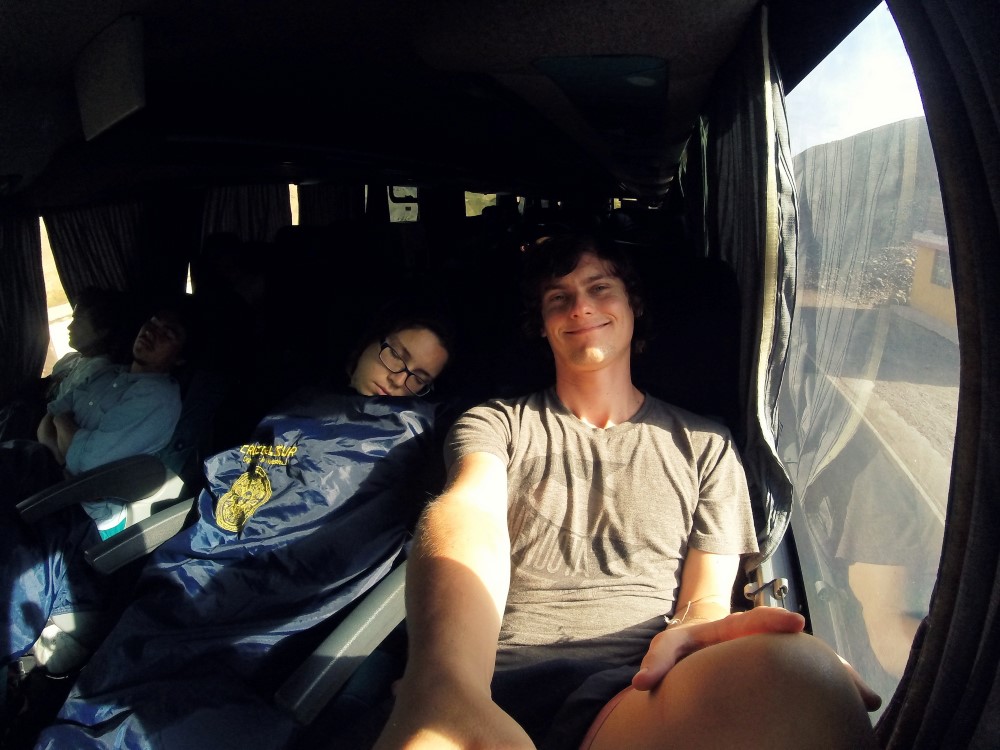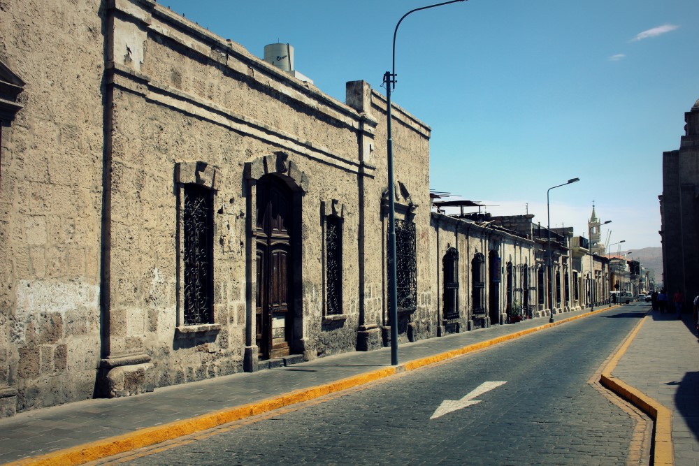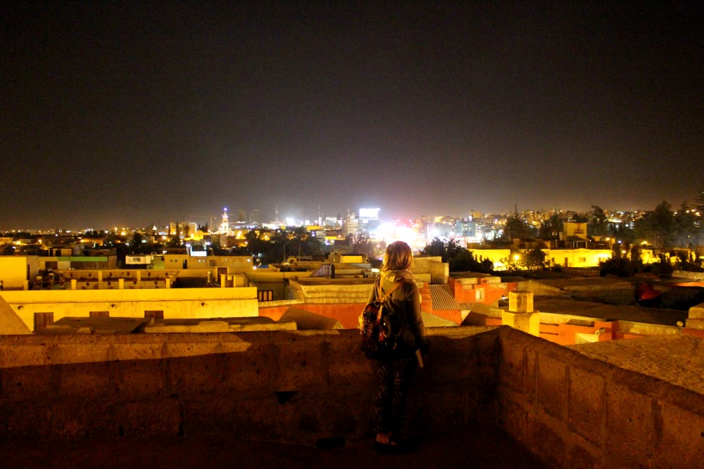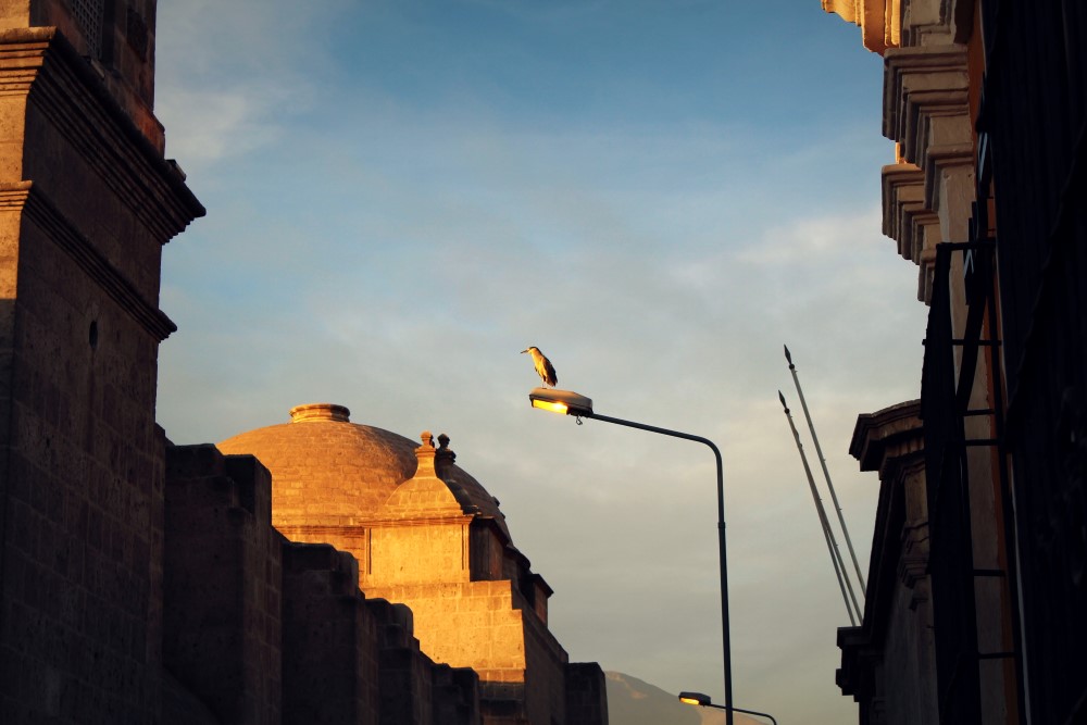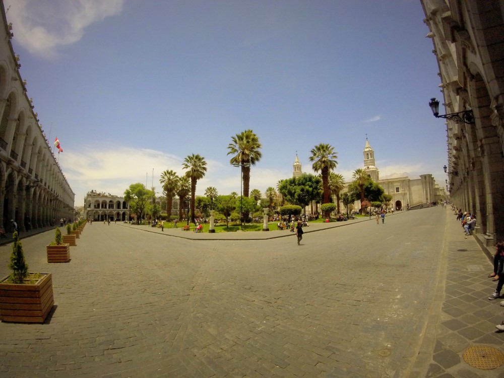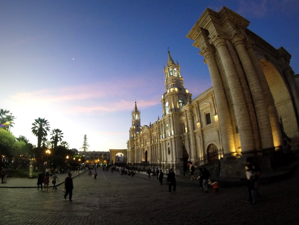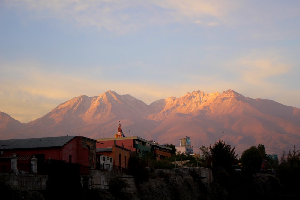 Nous avons dit au revoir aux dunes de sable d’Ica et pris un bus de nuit vers l’est pour rejoindre la ville coloniale d’Arequipa. Nous avions dégoté nos traditionnels sièges au second niveau et premier rang du bus pour apprécier la vue panoramique sur le désert péruvien et nous avons été accueillis par un chaud soleil matinal à notre arrivée dans notre nouveau lieu de vie pour la semaine à venir. Arequipa a été très bon avec nous. Chaque jour, sur la terrace du toit de notre hôtel, nous avions droit à un copieux petit-déjeuner avec oeufs, pain et jus de fruit frais, servi par une femme à l’enthousiasme débordant qui nous félicitait chaque matin de notre choix d’oeuf au plat ou oeufs brouillés ; le tout avec l’impressionnant Volcán Misti en arrière plan. Avec un ciel bleu qui ne nous a jamais trahi, des températures constantes autour des 25°C, et les bières artisanales toujours à disposition, Arequipa nous a tout de suite séduit.