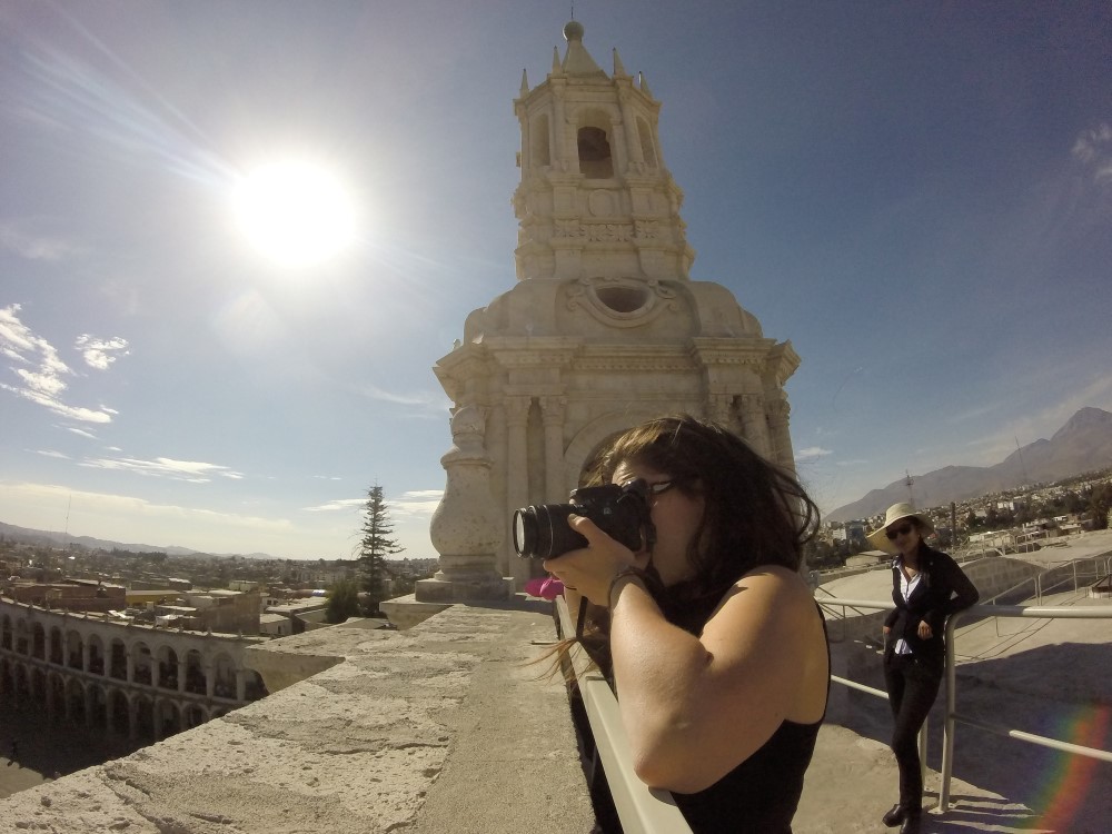 The fish-eye lens of the GoPro warps the bell-tower in a way it was not; dormant Volcรกn Misti in the background.