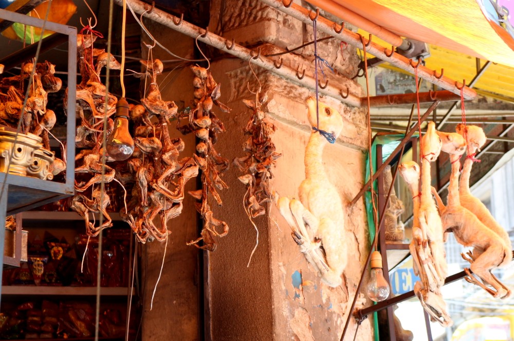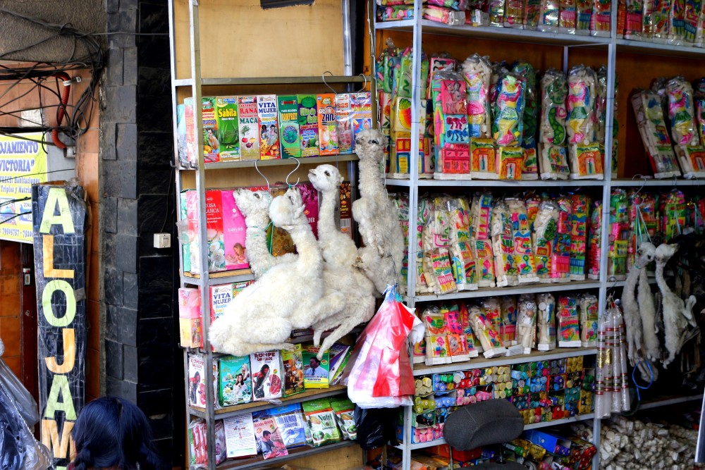 2073 La Paz Bolivia red cap tourLlama fetuses and babies on the Witch’s Street. Especially on construction sites, these are offered to appease the Pachamama, Mother Earth.
