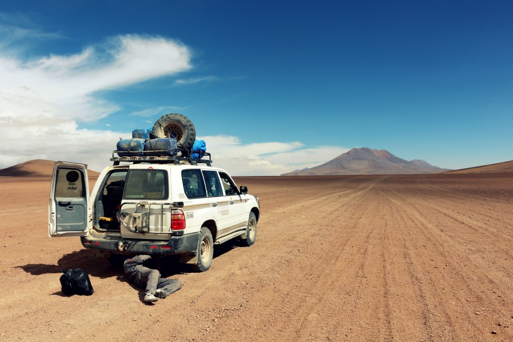 2172 Uyuni Salt Flats Bolivia Desierto de SiloliMario trying to reattach the fallen exhaust pipe…a second time. He offered comforting words such as “it is really bad to get stuck in the desert overnight” and “we are still really far from our destination for the night.”