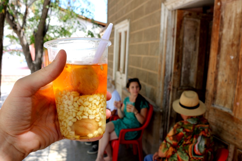 2225 Vicuña ChileMote con huesillos, a refreshing non-alcoholic drink consisting of dried peaches cooked in water, sugar and cinnamon. Once cooled, it is poured over freshly cooked, husked wheat. A great snack to drink and eat!