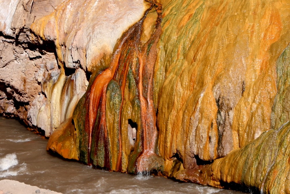 2445 Mendoza Argentina Tour Ruta 7 Puente del IncaThe Incan Bridge and an abandoned thermal spa. The bridge was formed by sediments and decorated by minerals from the thermal waters; foot traffic to the hotel/spa wore down the bridge until an avalanche shut down the whole spa-operation in 1965. The bridge has been closed since and the brilliant colors shine through once again.