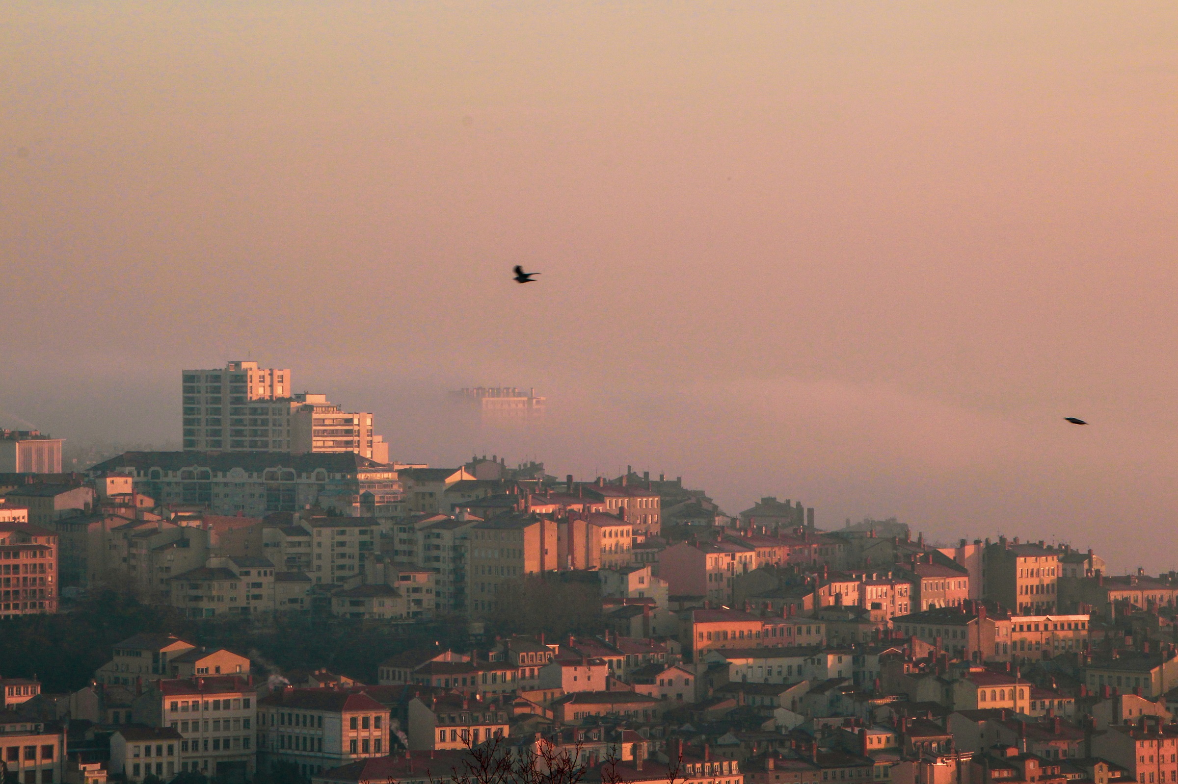 Croix-Rousse is a charming neighborhood on the neighboring hill. It was curious to see the fog rise from the Rhรดne River, swallowing part of Croix-Rousse completely.