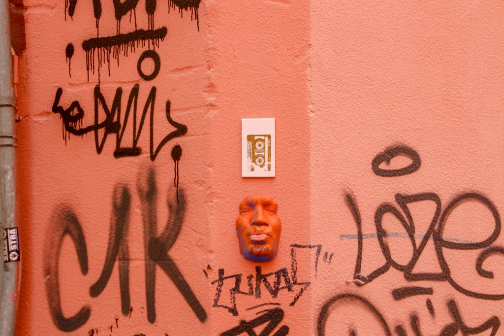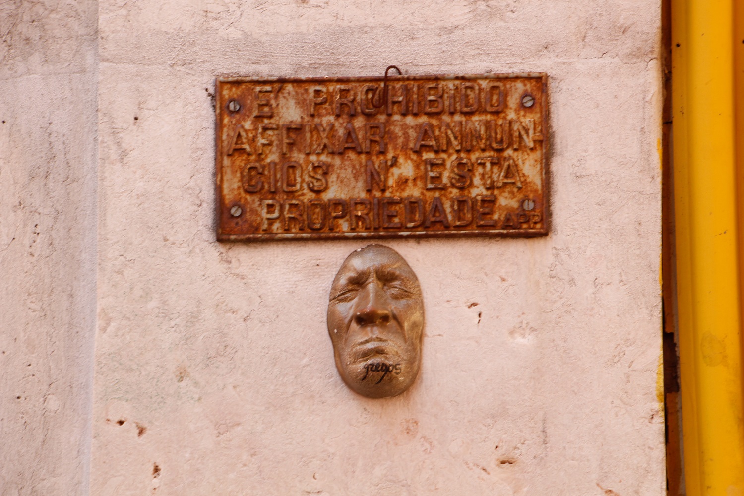 Facing the other Gregos face mold, this mask reacts to the sign above prohibiting affixing ads to this property – Lisbon