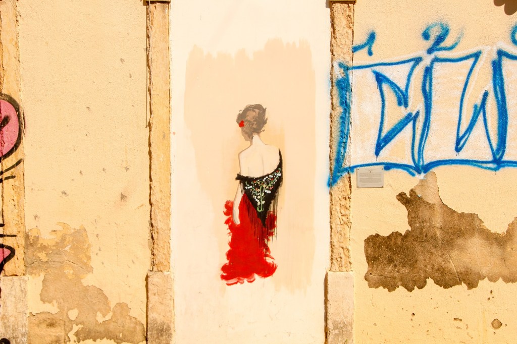 The folkloric music of Lisbon is called Fado. This painting depicts the traditional singer’s outfit in the neighborhood of one of the first Fado singers that rose to fame, Severa.
