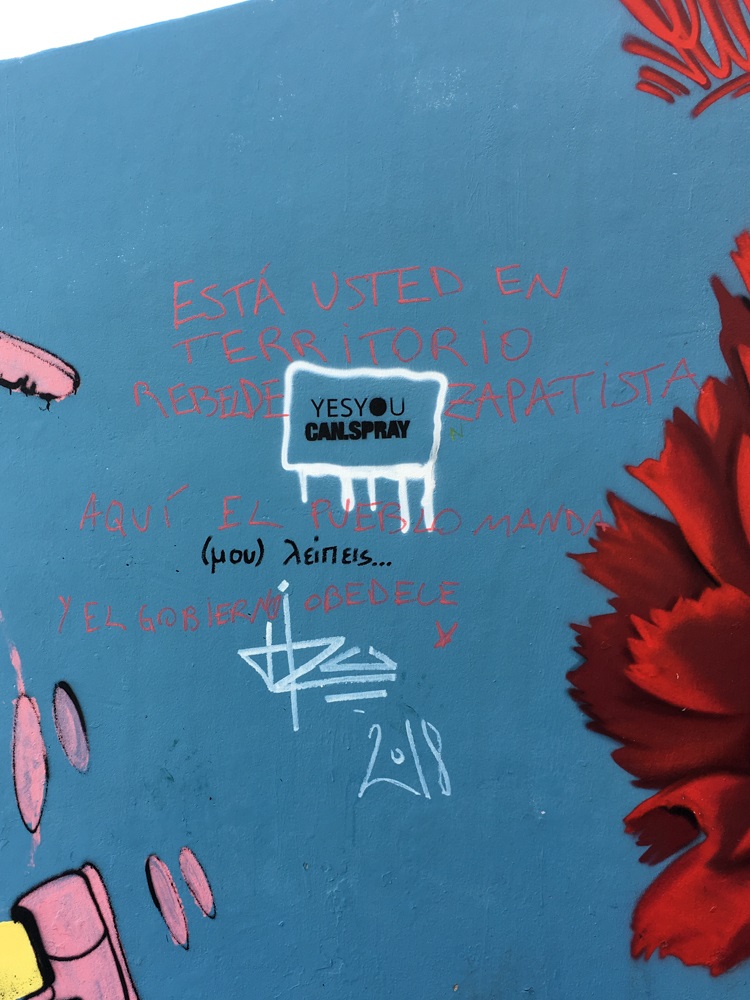 ESTA USTED EN TERRITORIO REBELDE ZAPATISTA. AQUI EL PUEBLO MANDA Y EL GOBIERNO OBEDECE. โYou are in Zapatista territory. Here the people rule, and the government obeys.โ We saw this same quote in a Zapatista community in the Chiapas region of Mexico, in Oventic.