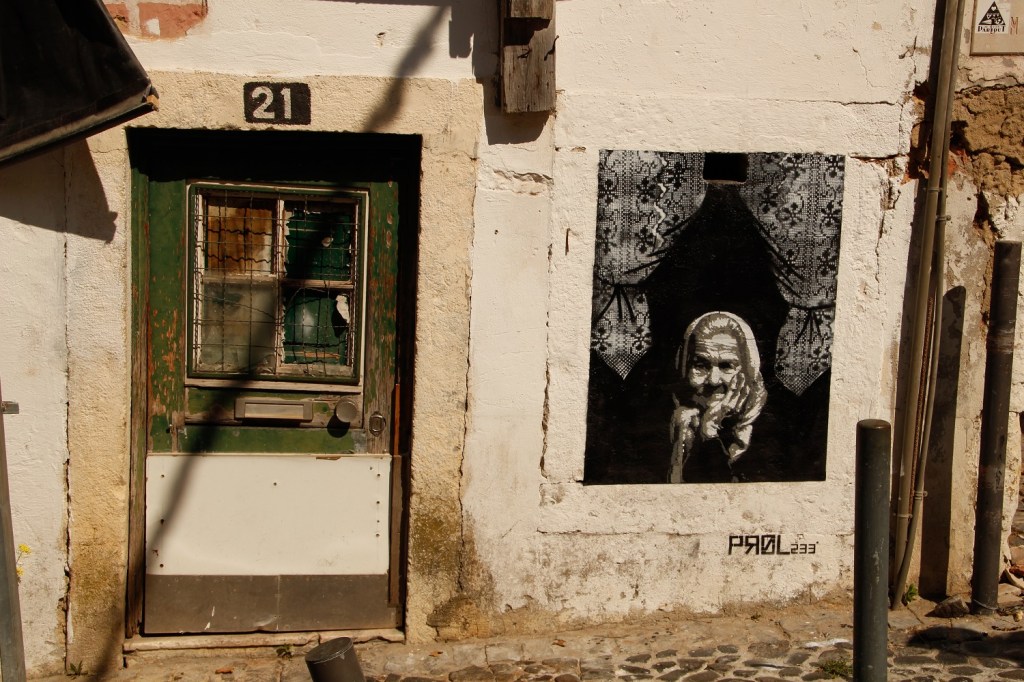 In 2009 artist Camilla Watson photographed local residents of the Mouraria and Alfama neighborhoods. Described as a โcollaborative community project involving the elderlyโ her goal is to bring intimacy to the walls of the narrow streets. Residents volunteered to be photographed and chose the photo that would be displayed. If youโre lucky, youโll recognize somebody from the photos hanging out in the streets.